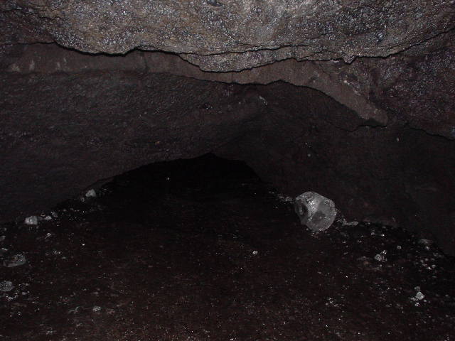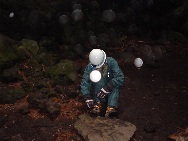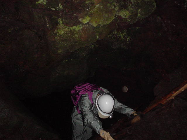 溶岩の地面にぽっかりあいた風穴の入り口。ここを降りていきます。この時点では30度くらい。レインコートが暑いです。