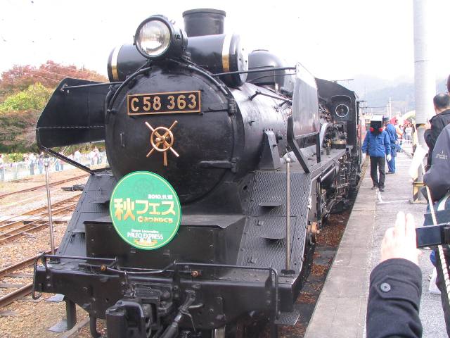 これが秩父鉄道のSL、C58。吹上小学校(埼玉県鴻巣市)に保存してあったのを現役復帰させたという、プロジェクトXの様なSL。