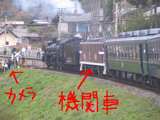 で、14:10発のSLで帰ります。この日はイベントという事で、SLの後ろに電気機関車(写真の茶色の車両)をつけて「蒸電運転」という珍しいスタイル。